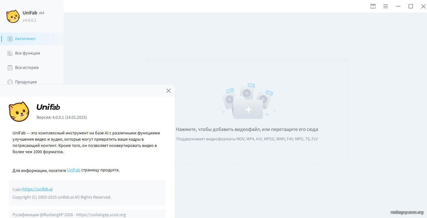 Исправлена потенциальная проблема с сбоями, когда источник ввода был HDR. --------------------------------------------------------------------------------------------------------------------- Русификаторы-активаторы 1-2-x.x версий15MB пред.3-4 версии AIO 4.0.0.0 Crack +RUS/turbit- htfl=374mb// 3.0.3.4 Crack +RUS/turbit- htfl=374mb +Русификатор-активатор(crack) v3.0.3.2 - 11.2025/turbobit =21mb + 3.0.3.2 Crack Portable/torbobit=400mb пред.3 версии AIO UniFab AI Video Enhancer